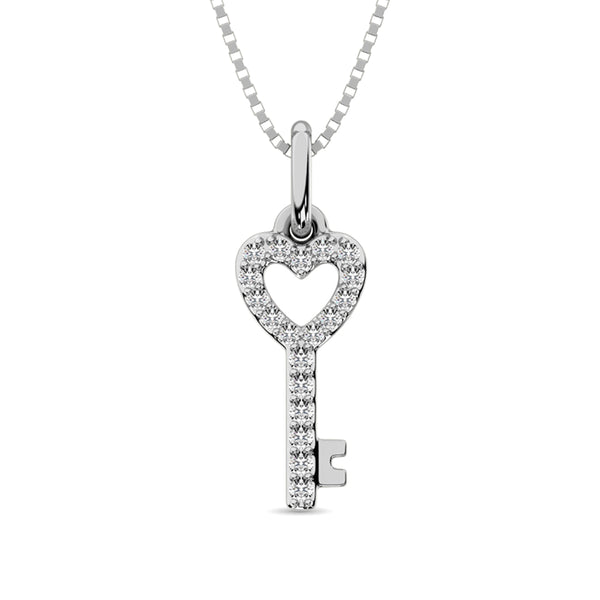 Give your sweetheart the key to your heart! Fashioned in 10K White Gold, this key-shaped pendant features a heart-shaped bow completely outlined with shimmering 1/10 ctw diamond accents.