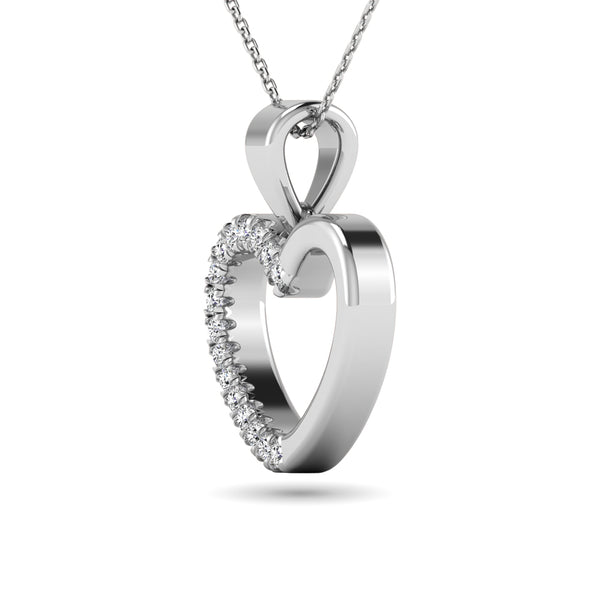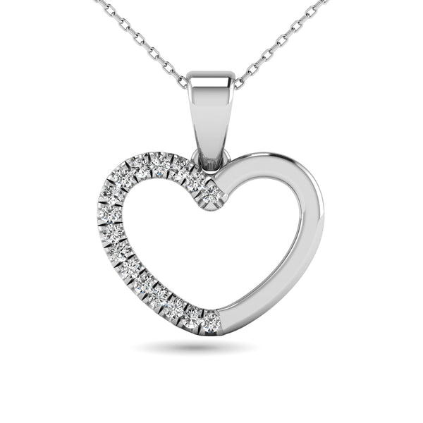 She will just adore with this shimmering expression of love. Fashioned on 10K white gold, half portion of this open style is outlined with shimmering 1/10 cts. of diamond accents. This pendant suspends along an 18.0-inch cable chain that secures with a spring-ring clasp.