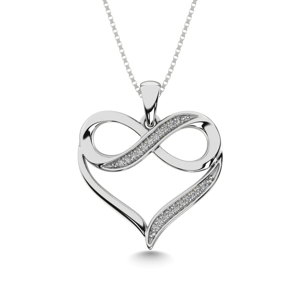 Celebrate your growing love with this charming open heart pendant. Crafted in warm 10K white gold, this heart-shaped frame is paired with infinity symbol to create a unique and elegant design. Ribbons of sparkling diamond accents add subtle shimmer to this eye-catching style.?The Total diamond carat 1/20 ctw.