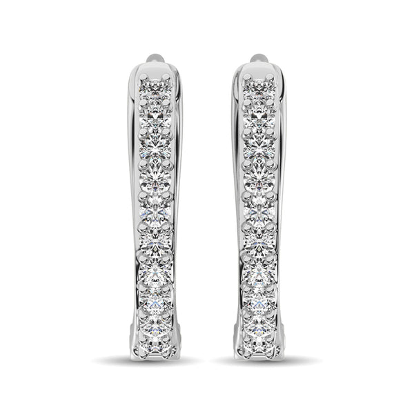 A bit of dazzle, a touch of sparkle! Each 10K White gold small huggie hoop Earrings has ten round diamonds in a prong setting. Wear these shimmering hoops for everyday style. Polished to a brilliant shine, these Earrings secure with hinged backs. Total diamond weight 1/3 ct.