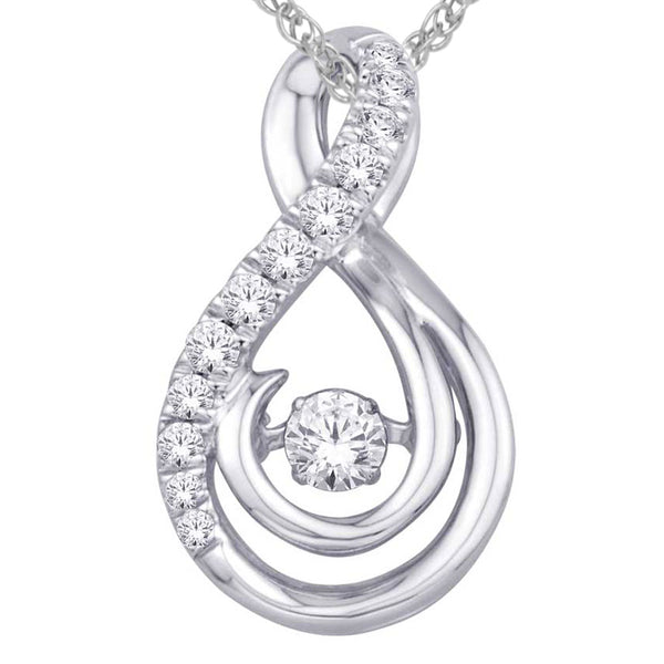 Crafted in warm 10K gold, this polished infinity symbol-shaped style features smaller diamonds. At its center, a sparkling 1/5 ct. diamond glistens in a unique setting that moves with every beat of her heart!!! The pendant suspended with 18 inch rope chain that secures with a spring-ring clasp.