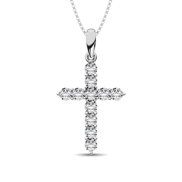 This Cross Pendant Crafted In 10K White Gold And Studded With Glittering Diamonds Weighing Approximately 1/8 Ct. Tw. Classic And Elegant, This Diamond Cross Pendant Is A Beautiful Expression Of Your Faith. This fashionable diamond pendant suspends from an 18.0-inch cable chain and secures with a spring-ring clasp.