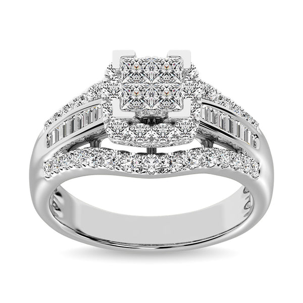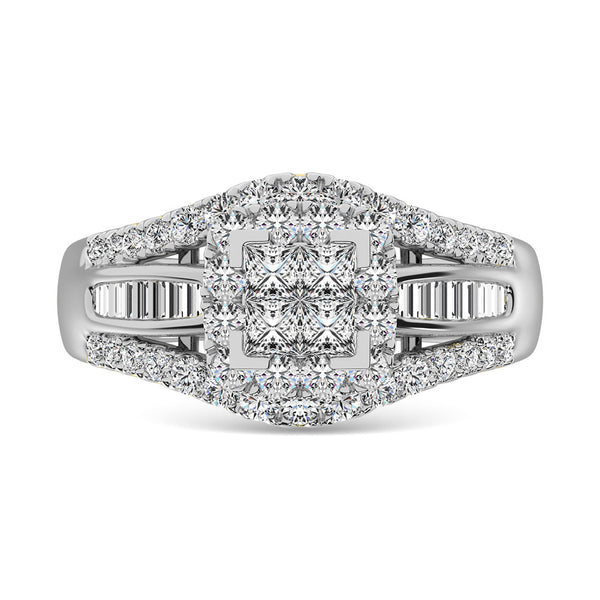 This amazing engagement ring is available in 10K White Gold. There are 62 princess / round / tapper diamonds with a total carat weight of 1 ct set in a channel / invisible setting / micro prong setting.