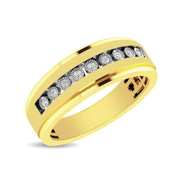 Exchange your vows with this handsome 10K yellow gold illusion Men?s band set with 9 round shape diamonds of totaling 1/10 ctw. Each channel-set diamond appears to float between a polished and satin-finished edging.