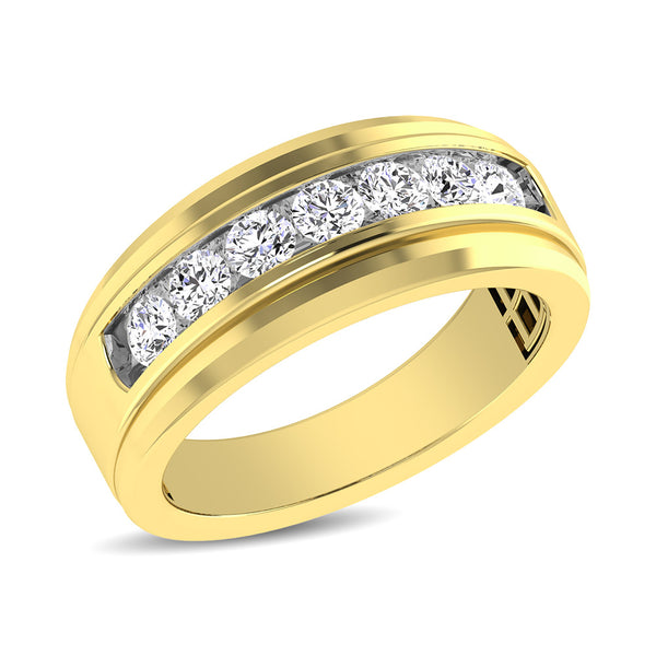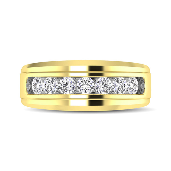 This stunning Wedding band is available in 10K Yellow Gold. There are 7 round diamonds with a total carat weight of 1/2 ct set in a channel setting.