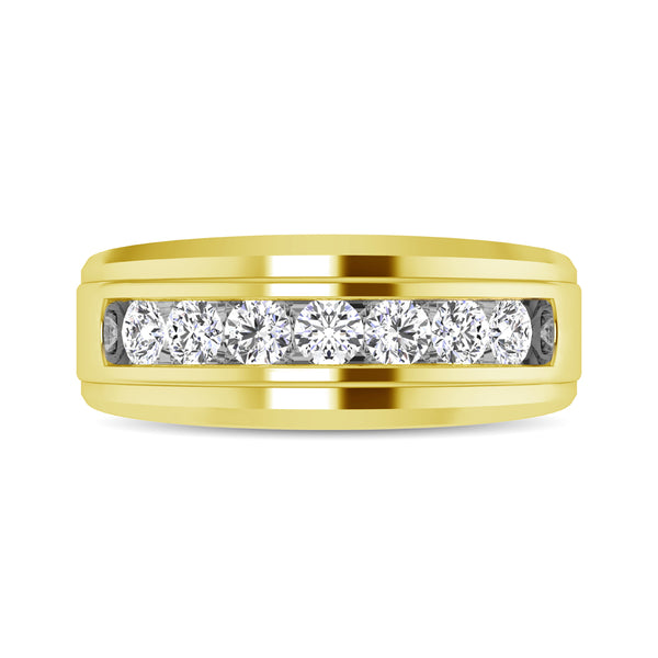 This amazing Wedding band is available in 10K Yellow Gold. There are 7 round diamonds with a total carat weight of 1 ct set in a channel setting.