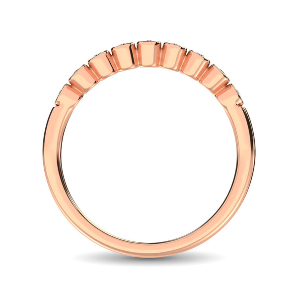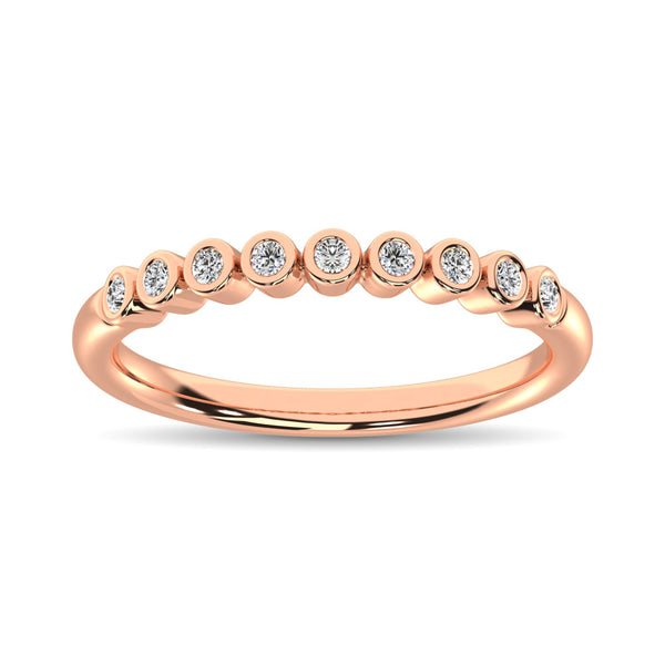 This glamorous stackable band is available in 14K Rose Gold. There are 9 round diamonds with a total carat weight of 1/10ct set in a bezel setting.