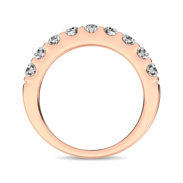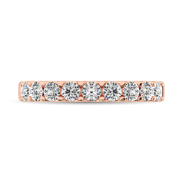 This stunning Anniversary Band is available in 14K Rose Gold. There are 9 round diamonds with a total carat weight of 3/4 ct set in a Prong setting.