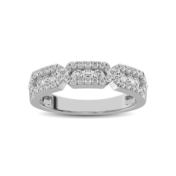 This amazing ring is available in 14K White Gold. There are 55 round diamonds with a total carat weight of 1/2 ct set in a Channel / Micro Prong setting.