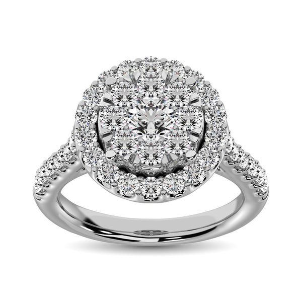 This 14K white gold cluster ring features 1/10 ctw center diamond wrapped in frame of smaller diamonds of totaling 1/2 ctw.