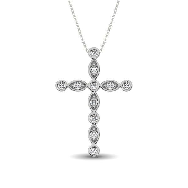 This stunning pendant is available in 14K White Gold. There are 11 round diamonds with a total carat weight of 1/4 ct set in a Prong/Bezel setting.