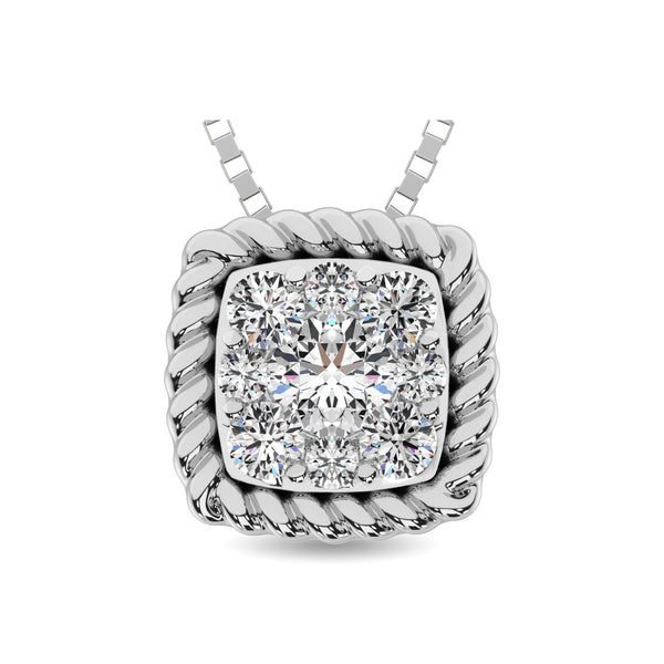 This amazing pendant is available in 14K White Gold. There are 9 round diamonds with a total carat weight of 1/6 ct set in a invisible / shared prong setting.