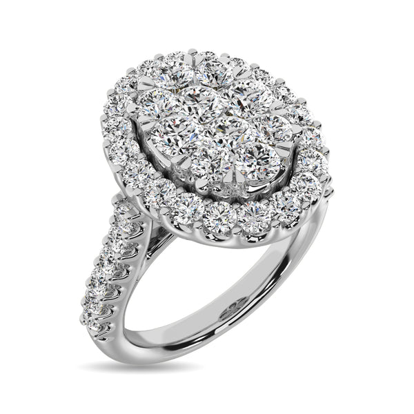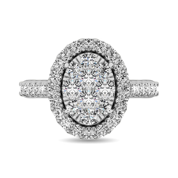 Crafted in 14K white gold, this ring features oval shape frame set with 1 ctw shimmering round diamonds and surrounded by smaller round accent diamonds.